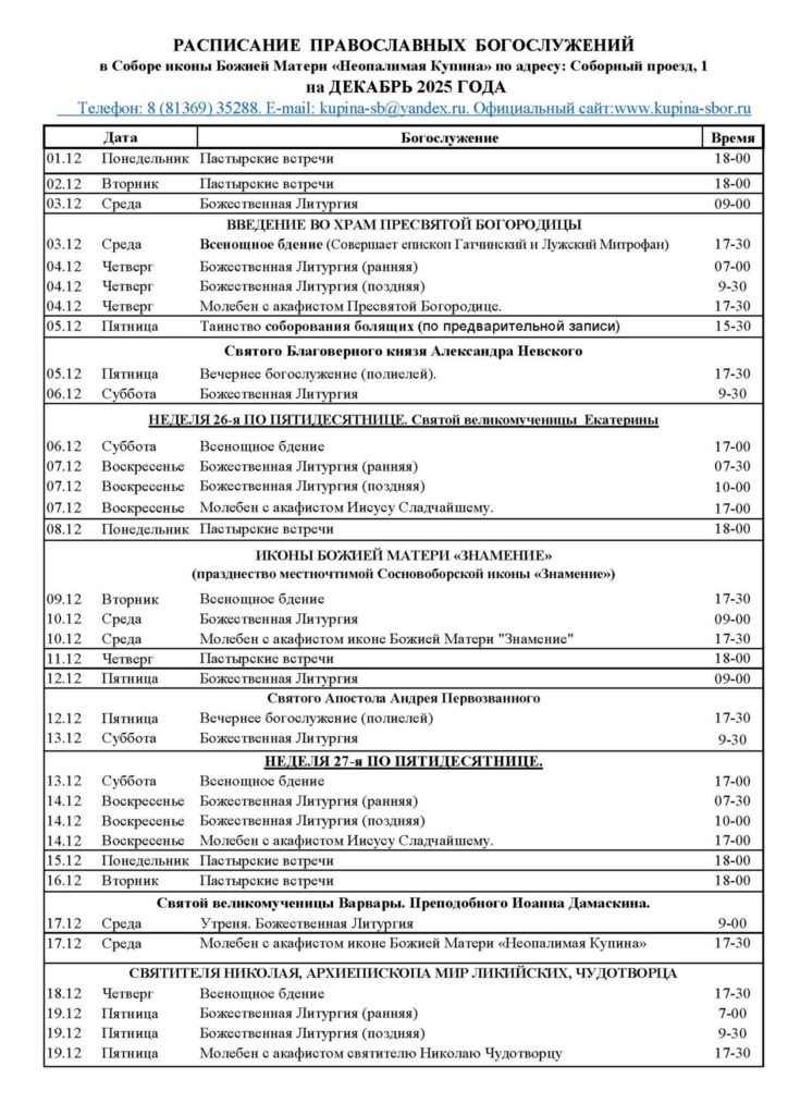 3 декабря 202520 ноября 2025 (по ст.ст.)СредаСедмица 26-я по ПятидесятницеИкона Богородицы «Соболевская» Священномученик Нирс, епископ и мученик Иосиф , ученик его, священномученики Иоанн и Саверий, епископыСвященномученики Исаакий и Ипатий, епископы, мученики Азат скопец, Сасоний, мученицы Фекла, Анна и многие другие мужи и жены, в Персиде пострадавшиеПреподобномученик Евтихий (Качур), игуменПреподобномученица Татиана Фомичева, послушницаПреподобный Григорий ДекаполитСвятитель Прокл, патриарх КонстантинопольскийМученики Евстафий, Феспесий и АнатолийСвященномученик Алексий Аманов, пресвитерСвященномученик Александр Сахаров, пресвитерСвященномученик Владимир Медведюк, пресвитерСвященномученик Иоанн Заболотный, пресвитерСвященномученик Алексий Никатов, пресвитерСвященномученик Василий Канделябров, пресвитерСвященномученик Николай Зеленов, пресвитерСвященномученики Иоанн Сарв, Емилиан Панасевич, Николай Покровский, пресвитерыПреподобномученик Арсений (Дмитриев), игуменПреподобномученик Иларион (Писарец), иеромонахПреподобномученица Иоанникия (Кожевникова), игуменияПреподобный Дамиан (в схиме Диодор) Юрьегорский, КаргопольскийМученик Дасий ДоростольскийМученик Азат Гадиабский (Персидский)Мученик Анатолий НикейскийМученица Анна Селевкийская (Персидская)Мученица Вауфа Селевкийская (Персидская)Мученица Денахиса ПерсидскаяМученик Евстафий НикейскийСвященномученик Емилиан Панасевич, пресвитерСвященномученик Иоанн Сарв, пресвитерМученик Иосиф ПерсидскийСвященномученик Ипатий Персидский, епископСвященномученик Исаакий (Исакий) Персидский, епископСвященномученик Нирса Сциагарцадатский (Персидский), епископСвященномученик Саверий Бет-Селевкийский (Персидский), епископМученик Сасоний Гузитский (Персидский)Мученица Фекла Персидская, деваИсповедник Феоктист Константинопольский, патрикийМученик Феспесий НикейскийСвятитель Иларион (Григорович)Священномученик Александр (Сахаров) Шатурский1Тим.1:18–20,2:8–15, Лк.18:15–17,26–30,, Лк.18:31–34, Евр.7:26–8:2, Ин.10:9–16